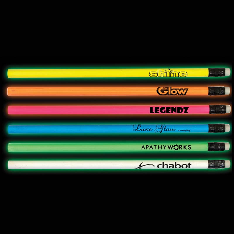 *NEW* Barrel and eraser glow in the dark. Size: 7.5“. Average shipping .10 per piece. Colors may be assorted every 100 pcs. Maximum imprint area 4.5” x .75”. Set Up: $28