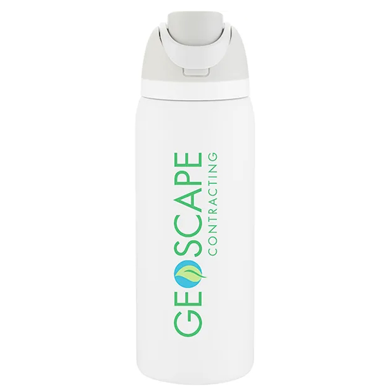 32 oz double wall 18/8 stainless steel thermal bottle with copper vacuum insulation, dual-purpose threaded lid, push-button locking mechanism, sip opening, built-in straw, and powder coated finish. Size: 32 oz. Average shipping 1.50 per piece. Colors may be assorted every 24 pcs. Maximum imprint area 3” x 4”. Set Up: $60
