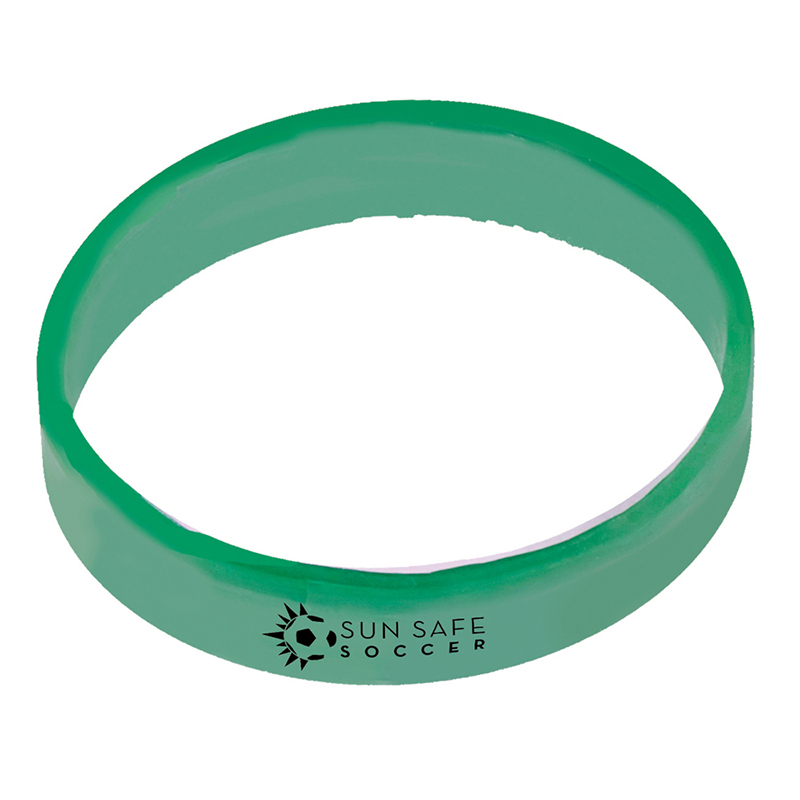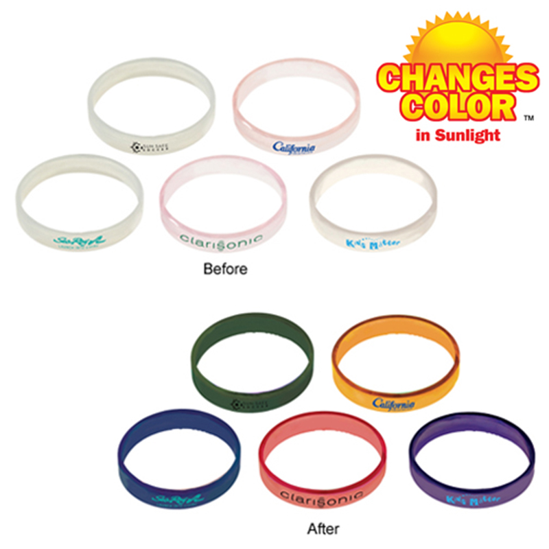 Right before their eyes, these popular bracelets will rapidly change color as soon they are exposed to sunlight and then change back again when brought indoors. Non allergenic, latex free thermoplastic. Size: .5" x 7.5". Average shipping .12 per piece. Colors may be assorted every 250 pcs. Maximum imprint area 3" x .375". Set Up: $46