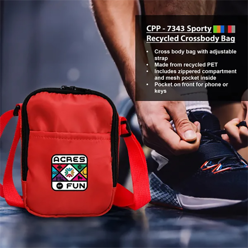 *NEW* Includes roomy zippered compartment, mesh interior pocket, and slip opening front pocket for phone or keys. Price includes your full color imprint! Made from recycled PET. Size: 5.5“ x 7.25“ x 2". Average shipping 1.00 per piece. Colors may be assorted every 10 pcs. Maximum imprint area 3” x 2”. Set Up: $48