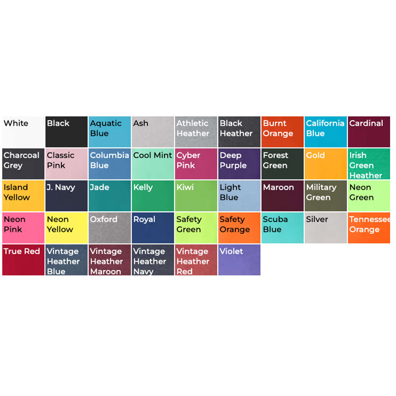 Double-needle coverstitched front neck. Shoulder-to-shoulder tape. Double-needle stitched hemmed sleeves and bottom. Seamless 1x1 rib collar. Seamless body for a wide printing area. Tearaway label. Average shipping .60 per piece. Colors and sizes may be assorted in any breakdown. Set Up: 38.00