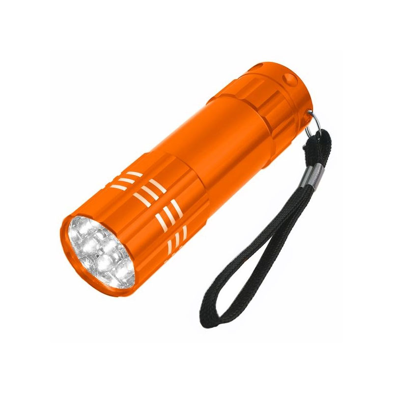 Lightweight, rich enamel color finish body with metallic silver accent, decorative dimple and ribbed accents, 9 bright white LED bulbs, Easy-to-use big black push button. Includes black strap and batteries. Size: 3.50" x .9375". Average shipping .25 per piece. Colors may be assorted every 25 pcs. Maximum imprint area 1" W x .375" H. Engraved in White or Black. Set Up: $38