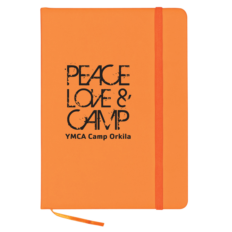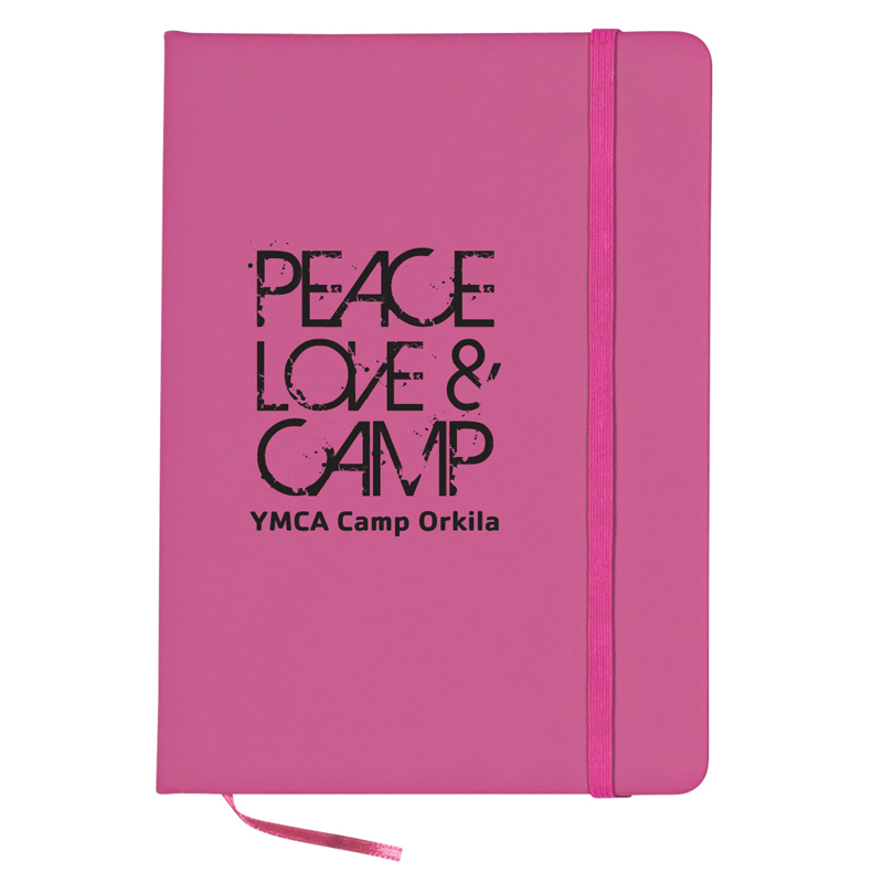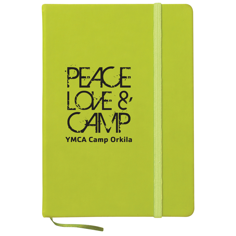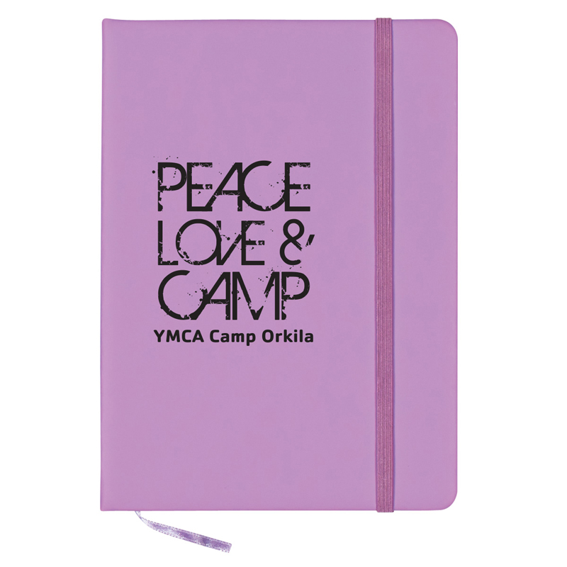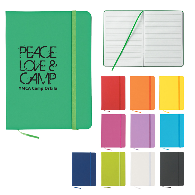 *BEST SELLER* Beautiful faux leather bound book with soft, vividly colored cover and matching ribbon bookmark and elastic closure. Roomy comfortable size, 80 lined pages, keepsake for a lifetime. Full color imprint available. Size: 5" x 7". Average shipping .60 per piece. Colors may be assorted every 50 pcs. Maximum imprint area 3" x 5". Set Up: $38