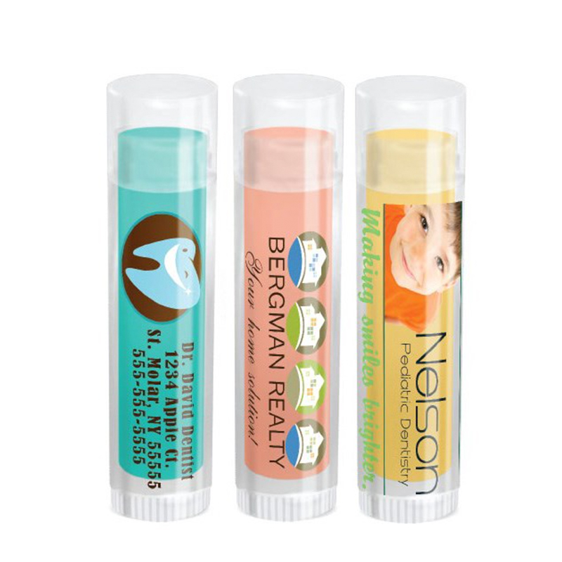 Everyone will love this vibrant colorful lip balm with a clear .15 oz tube and cap. Features your full color logo or graphic in assorted flavors if desired. All natural ingredients: organic sunflower oil and aloe vera oil, beeswax, organic extra virgin olive oil, organic hempseed oil, vitamin E, and rosemary extract. Average shipping .10 per piece. Flavors may be assorted every 25 pcs. Maximum imprint area 1.7" x 1.465". Set Up: $48