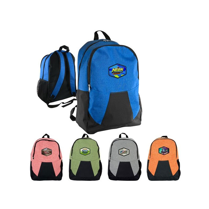 *NEW* Poly-canvas backpack with two compartments, each with its own inner pockets. It has a mesh pocket on the side for water bottles, adjustable shoulder straps and an easy-carry handle. Price includes your full color imprint on your choice of patch shape. Size: 12“ x 17.5“ x 6". Average shipping 1.50 per piece. Colors may be assorted every 25 pcs. Maximum imprint area 4” x 3.25”. Set Up: $48