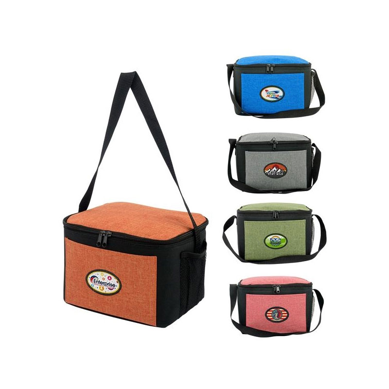 *NEW* Insulated zippered cooler with full-top opening, mesh pocket, and shoulder strap. Holds lunch plus beverage, or up to nine 12 oz cans. Price includes your full color imprint on your choice of patch shape. Size: 9“ x 8“. Average shipping 1.00 per piece. Colors may be assorted every 50 pcs. Maximum imprint area 3” x 2". Set Up: $48