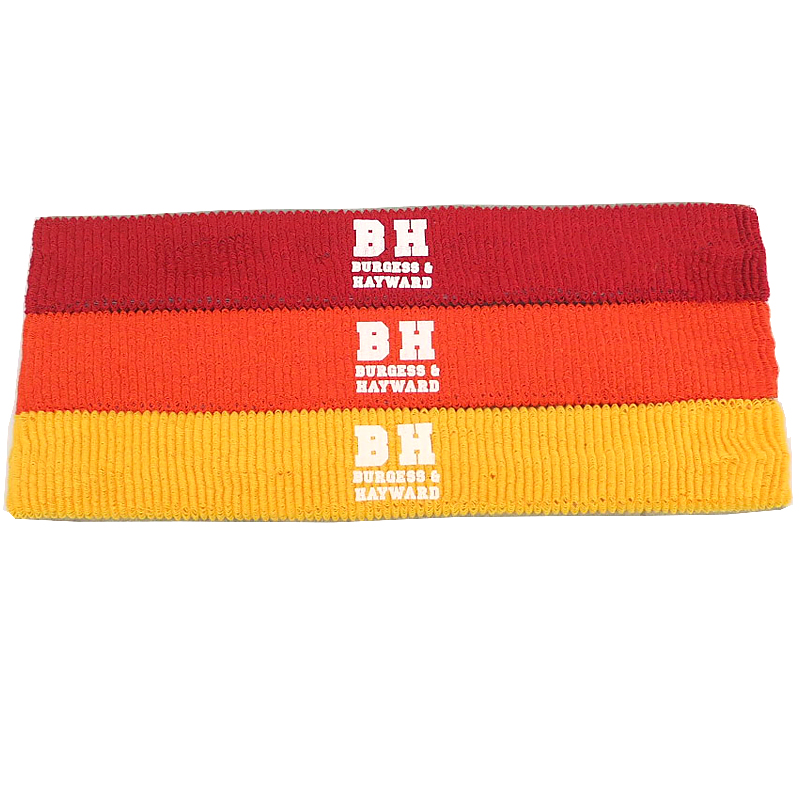 Great for identifying teams or for tribe spirit. Heavyweight sweatband features your heat transfer logo on 2-ply terry material made of 93% cotton/ 7% elastic. Direct embroidery also available, appx 2.50 ea addl. Size: 6" x 2". Average shipping .15 per piece. Colors may be assorted every 60 pcs. Maximum imprint area 5" x 1.25". Set Up: $38