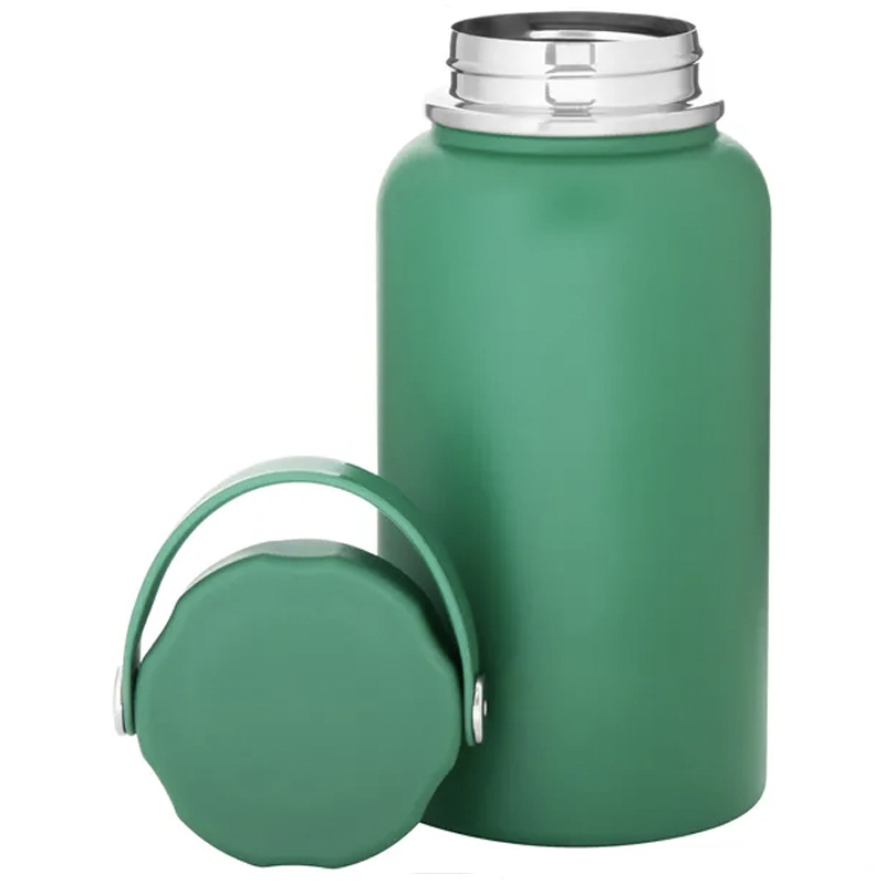 *NEW* Single wall 18/8 stainless steel bottle with matching threaded lid, carrying handle, and powder coated finish. Full color imprint option 1.75 ea addl. Size: 7.5“ x 3.5“. Average shipping 1.50 per piece. Colors may be assorted every 24 pcs. Maximum imprint area 4.35” x 3.5”. Set Up: $48