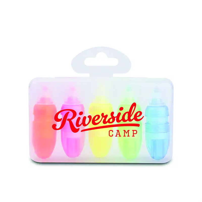 *NEW* Delightful set includes five vibrant highlighters, each paired with a unique scent: blueberry (blue), orange (orange), lemon (yellow), strawberry (pink), and apple (green). Clear, compact case for easy organization. Size: 5“ x 3“. Average shipping .18 per piece. Maximum imprint area 2.5” x 1.5”. Set Up: $48