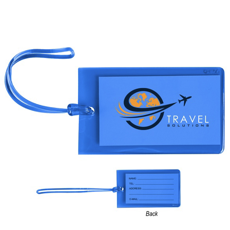 *NEW* Vinyl ID tag with matching strap. Useful on any item needing identification. Fun "gummy-bear" feel make recognizing similar bags easy. Appreciated giveaway that will be used for the life of a bag or longer. Includes slip-in I.D. card. Size: 4.25" x 2.5". Average shipping .10 per piece. Colors may be assorted every 100 pcs. Maximum imprint area 1.75" x 3.25". Set Up: $36