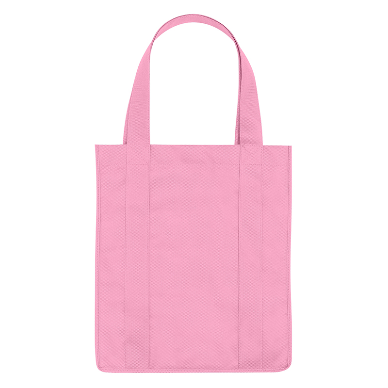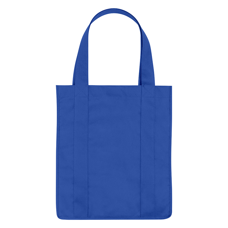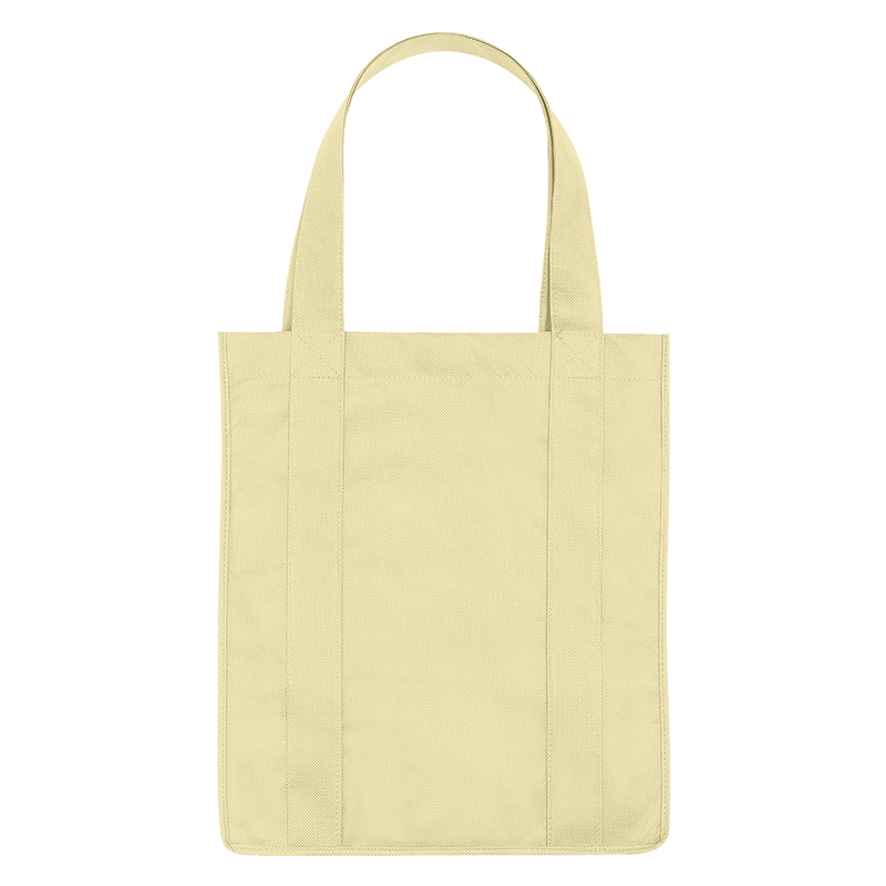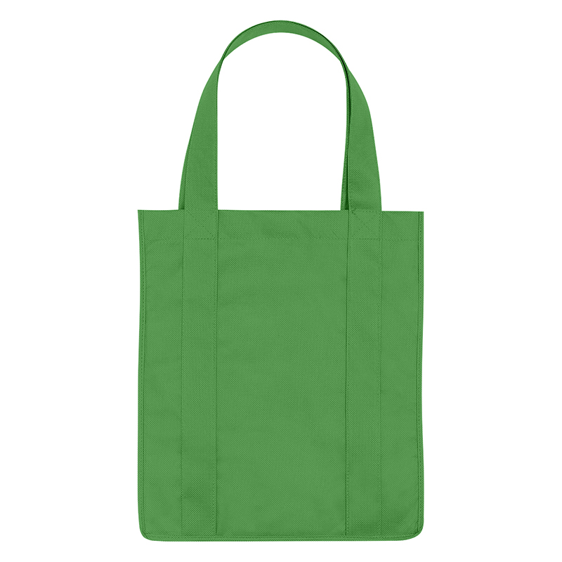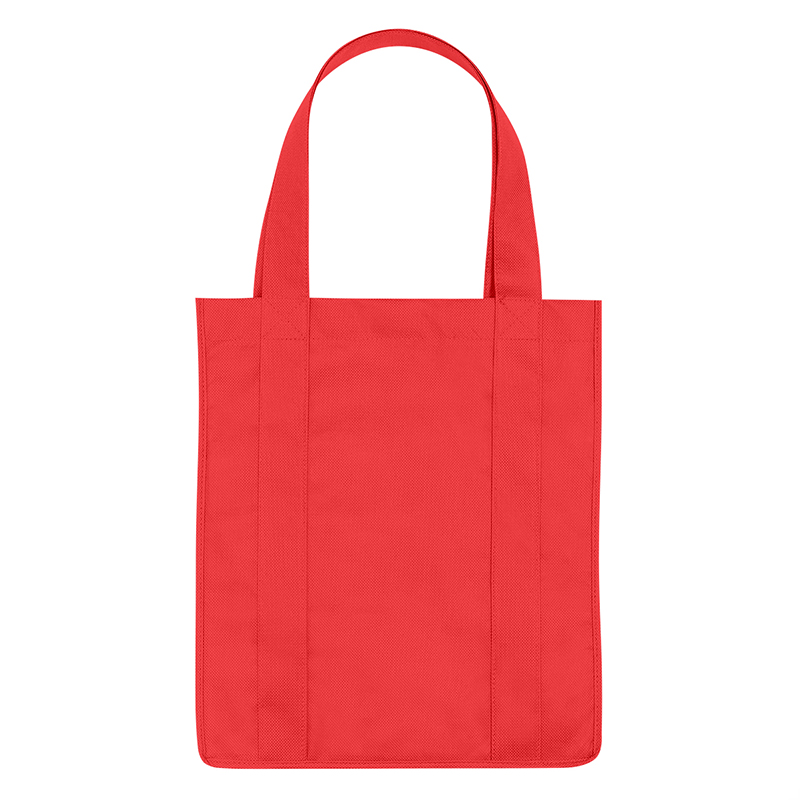 Recyclable tote bag with reinforced 20" handles. Made of extra strong, 90 gram, non-woven, coated waterresistant polypropylene. Reusable and hand washable. Great for grocery stores, markets, book stores, etc. Super roomy, 10" gusset with matching covered bottom insert! Size: 13" x 15". Average shipping .40 per piece. Colors may be assorted every 50 pcs. Maximum imprint area 5" x 10". Set Up: $48