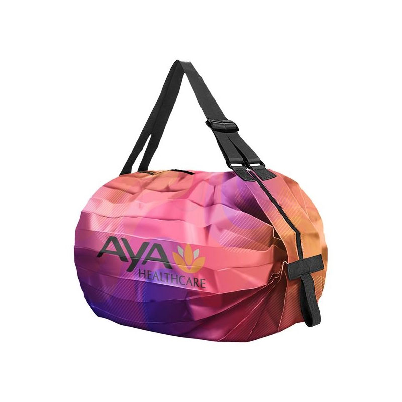 Full color, all over, dye sub imprint! Super compact when rolled (3.25" x 2.75") and magically large when expanded (15.75" x 26"). Features a waterproof polyester, nylon zipper and adjustable web handle. Size: 15.75“ x 26“. Average shipping 1.00 per piece. Maximum imprint area 28.35" x 19.49". Set Up: $125