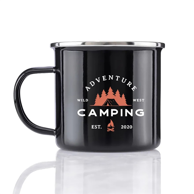 *NEW STYLE* High quality enamel-coated stainless steel. Stainless steel accent rim. Solid shiny color exterior with white interior and an ear-shaped handle. Price includes a two sided or wrappng imprint. Size: 4"“ x 5.5". Average shipping .1.00 per piece. Colors may be assorted every 50 pcs. Maximum imprint area 2.5” x 1.875”. Set Up: $54