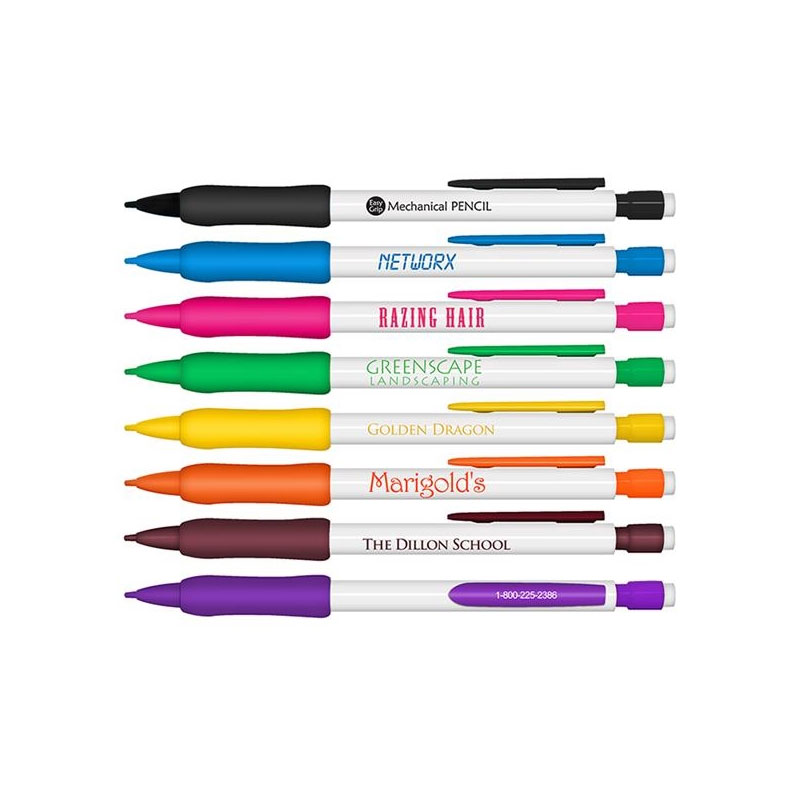White barrel mechanical pencil with cushioned rubber grip. Contains three refillable #2 HB black leads with white eraser. Size: 6“. Average shipping .15 per piece. Colors may be assorted every 50 pcs. Maximum imprint area 1.75" x 0.375”. Set Up: $50