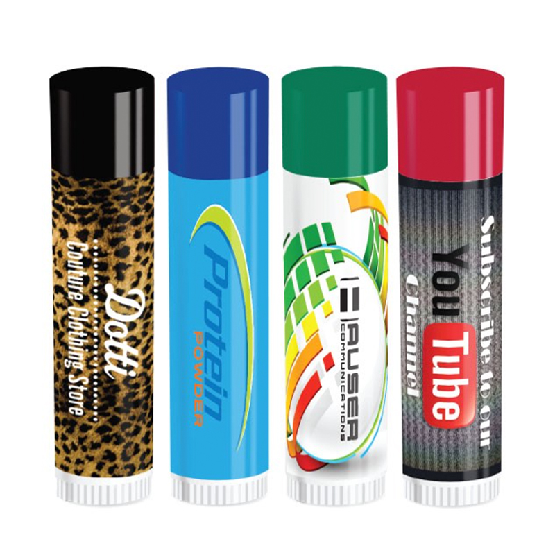 Features your full color logo or graphic in assorted flavors if desired! All natural ingredients: organic sunflower oil and aloe vera oil, beeswax, organic extra virgin olive oil, organic hempseed oil, vitamin E, and rosemary extract. To have cap color indicate flavor add .10 ea, but to have flavor indicated on label, please add .05 ea to price. Size: .15 oz. Average shipping .10 per piece. Flavors may be assorted every 25 pcs. Maximum imprint area 1.75" x 1". Set Up: $48