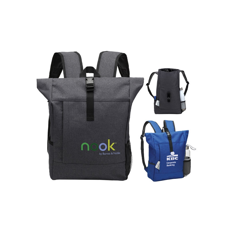 *NEW* Stylish, tech oxford material. Large front zipper pocket and a large main compartment. Two side pockets allow for easy access to water bottles and other important items. Fast access, roll top main compartment secured with the attached clip. The padded back and shoulder straps add comfort. Size: 11" x 18.5" x 4.5". Average shipping 1.25 per piece. Colors may be assorted every 30 pcs. Maximum imprint area 5.5" x 3.5". Set Up: $48
