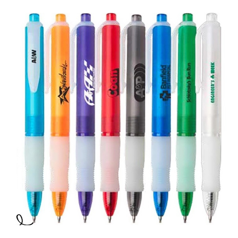 *NEW* Back by popular demand, this pen has alway's ben our owners favorite of all time! Wide-body retractable gel pen with rubber grip. Colored translucent frost barrel, ferrule and plunger with natural clip and grip. High-quality black or blue gel ink. Writes like a dream! Size: .46" x 5.75". Average shipping .10 per piece. Colors may be assorted every 100 pcs. Maximum imprint area 1.5″ x .625″. Set Up: $20