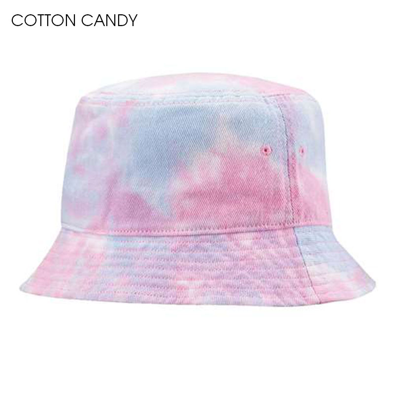 Tie-dyed bucket cap 100% cotton. Unstructured. Sewn eyelets. 2" brim. Average shipping .75 per piece. Colors and sizes may be assorted in any breakdown. Maximum imprint area 4” x 2”. Set Up: 38.00
