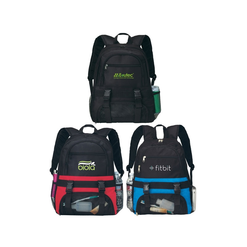 Made of 680D polyester. Roomy main compartment and various zippered pockets. Features two side mesh pockets, a front mesh zippered pocket, and plastic buckle straps for securing gear. Size: 12" x 17" x 5.5". Average shipping 1.25 per piece. Colors may be assorted every 50 pcs. Maximum imprint area 5.5" x 3". Set Up: $40