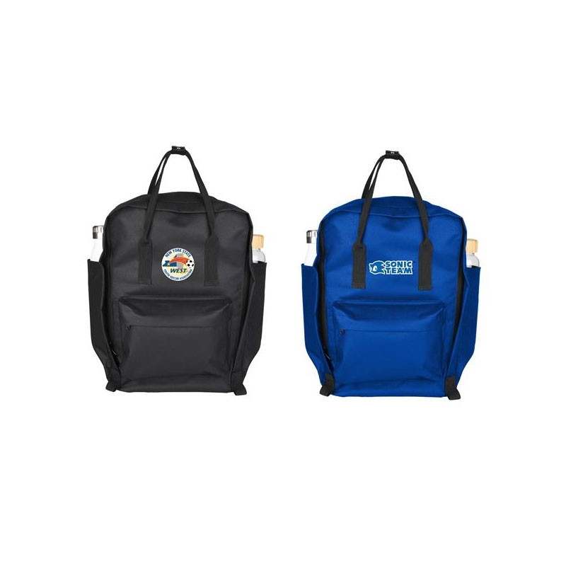 Sturdy looped top handles to carry in hand. Zips completely open for full horizontal access to main compartment. Convenient and spacious front pocket. Side pockets. Adjustable straps. 600D polyester with PVC coating. Size: 10.5“ x 15“. Average shipping 1.75 per piece. Colors may be assorted every 50 pcs. Maximum imprint area 5” x 3”. Set Up: $40