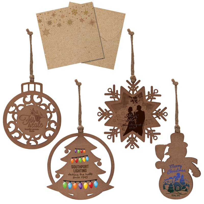 *NEW* Two layers of all-natural birch wood make up this beautiful holiday ornament. An elegant design is cut out and pressed on top of a solid stained backing, adding a level of dimension to this holiday creation. Add your logo to the backside of this ornament with a stunning laser-engraved imprint to create lasting branding impressions for years to come. Product Options: Bear in Woods, Tree, Snowman, or Snowflake - laser engraved back. Size: 3“ x 11/32“. Average shipping 1.22 per piece. Maximum imprint area 2.5” x 2.5”. Set Up: $28