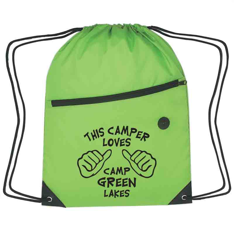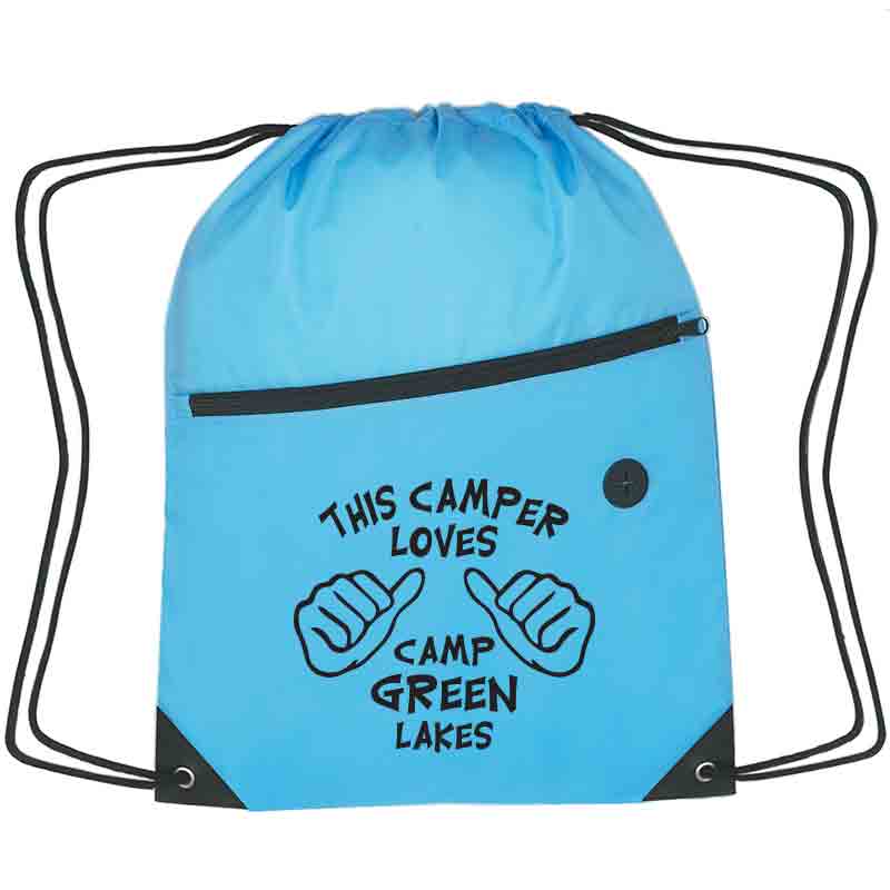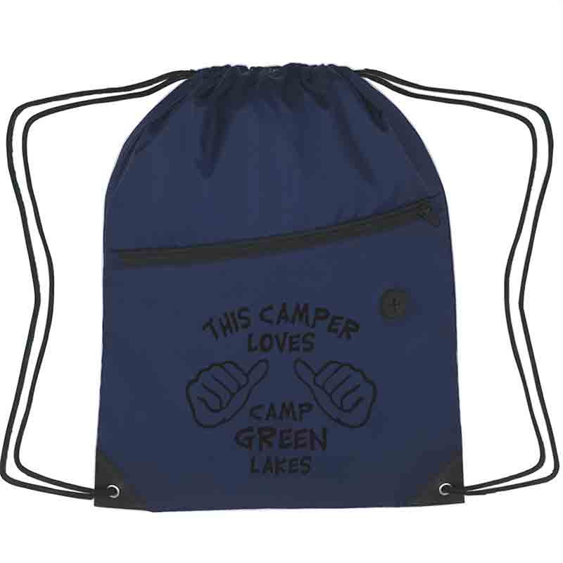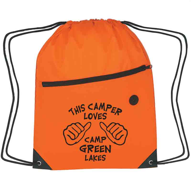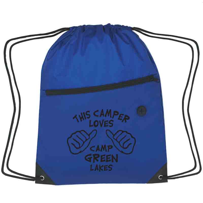 Features secure large front zippered pocket, built in slot for ear buds, popular drawstring closure with reinforced eyelets. Durable 210D polyester. Size: 13.5" x 18". Average shipping .40 per piece. Colors may be assorted every 50 pcs. Maximum imprint area 9" x 4.5". Set Up: $48