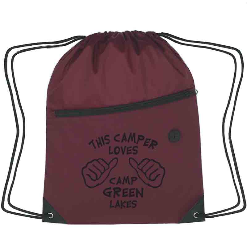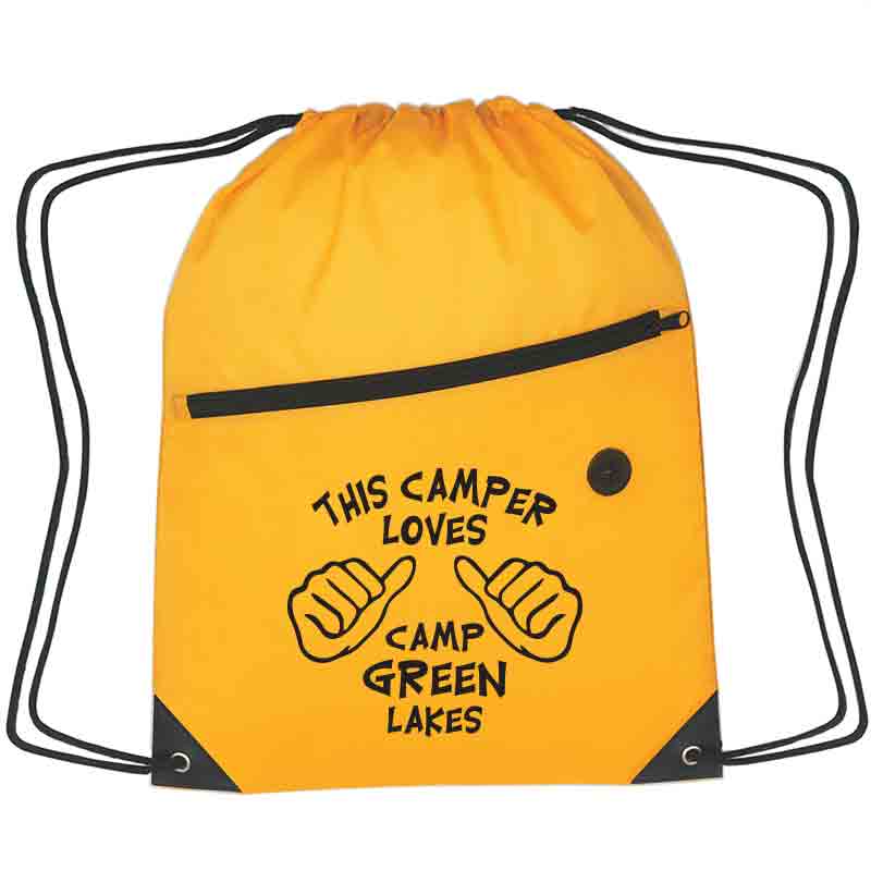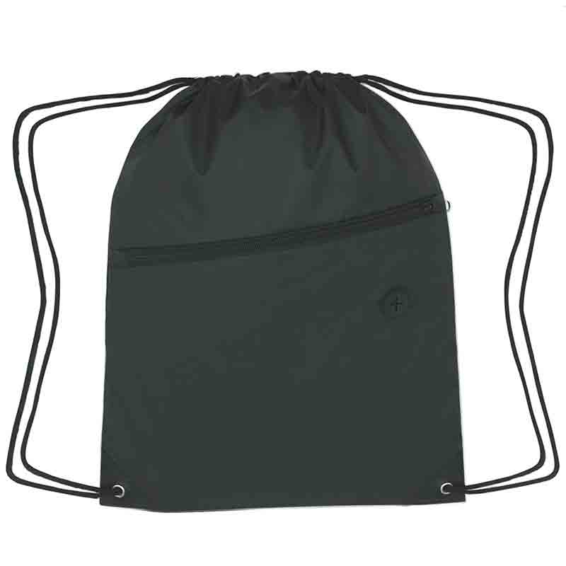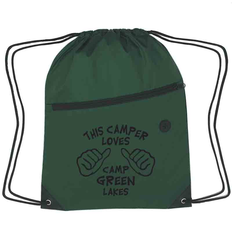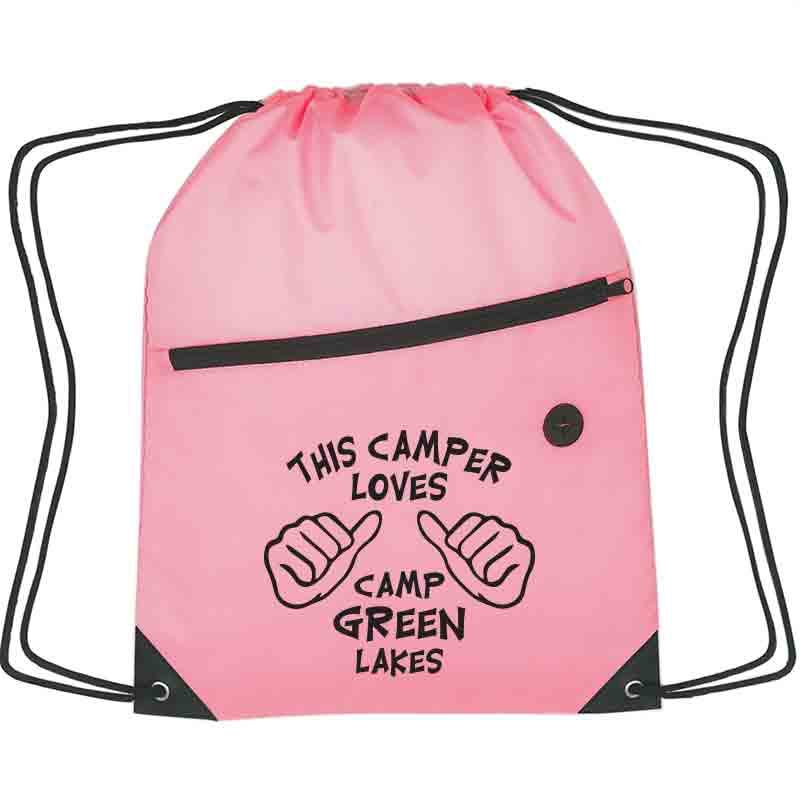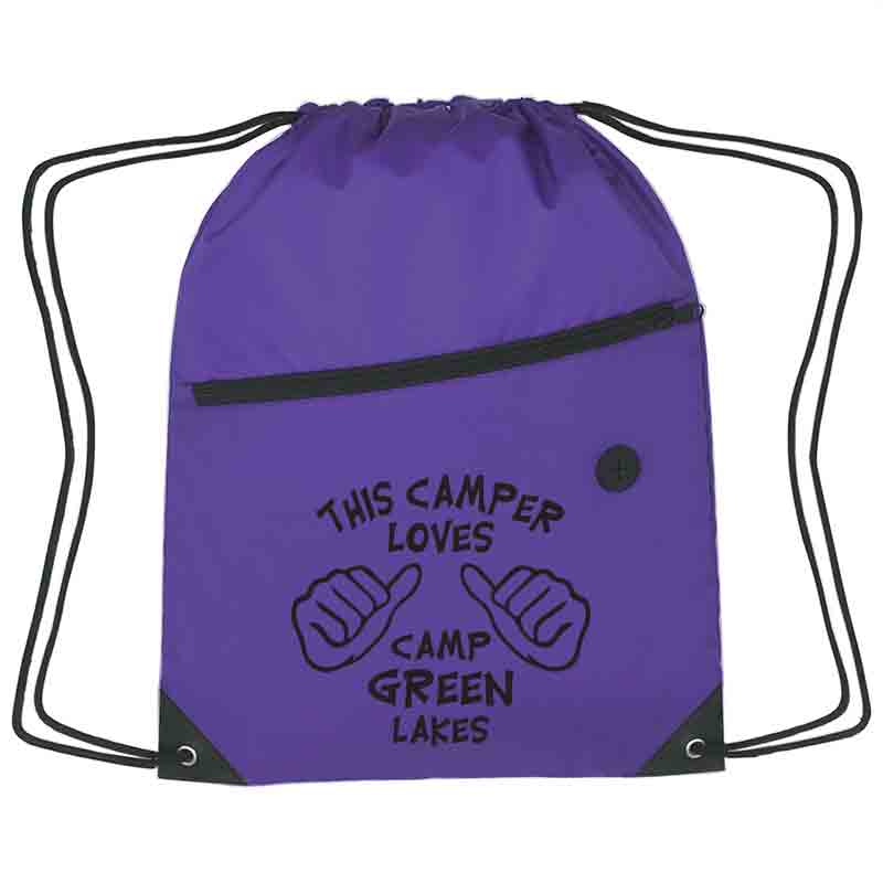 Features secure large front zippered pocket, built in slot for ear buds, popular drawstring closure with reinforced eyelets. Durable 210D polyester. Size: 13.5" x 18". Average shipping .40 per piece. Colors may be assorted every 50 pcs. Maximum imprint area 9" x 4.5". Set Up: $48